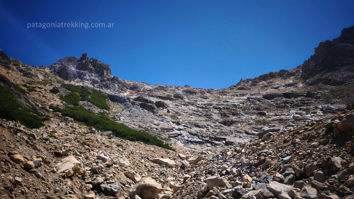 El acarreo se baja rápido y enseguida estábamos en el vallecito bajo la aguja Campanile. Encontramos una gran roca que daba sombra y nos tiramos a descansar un rato. Después, retomamos la bajada.