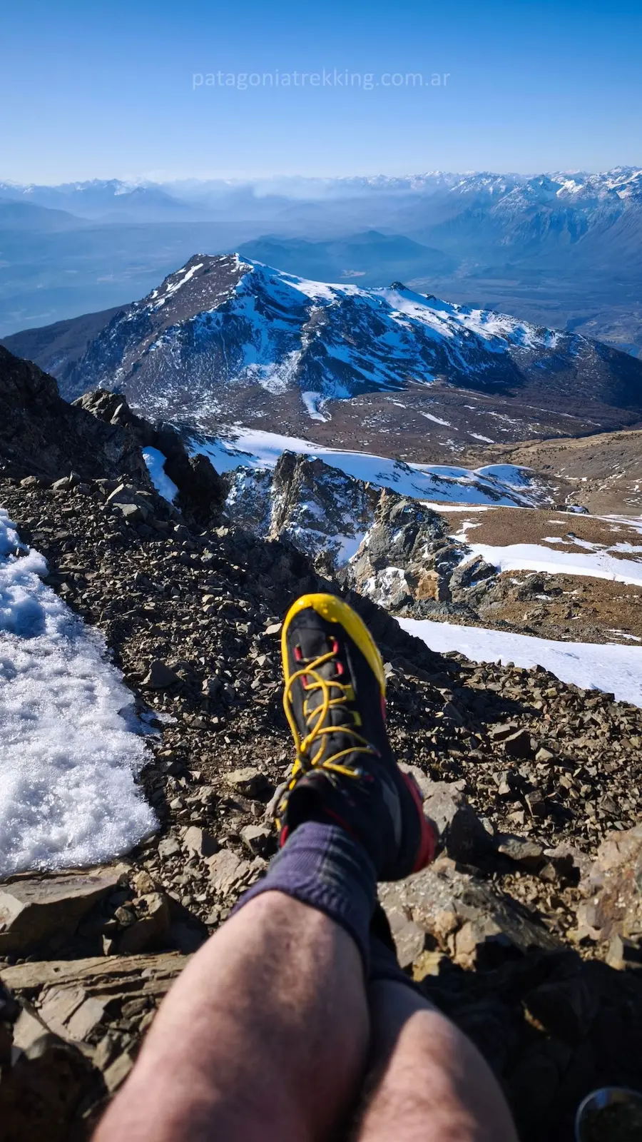 La cumbre cae abrupta hacia el sur y el oeste. Me acomodé en un rincón seco, preparé unos mates y dejé que la vista hiciera lo suyo: alla abajo y al norte, el filo Huemul que había recorrido antes; al este, la estepa extendiéndose en colores claros; al oeste, El Bolsón y Lago Puelo, pequeños y lejanos.
