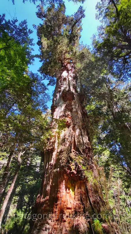 El camino sigue un par de horas con poco desnivel, pasando cada tanto por algún codo del Río Rayado. El agua baja en arroyos desde el cerro y se une al cauce principal del Rayado. La calma tampoco se termina con la subida. Empieza con decisión y atraviesa un Alerzal Milenario. Hay un ejemplar inmenso justo junto al cartel indicador.