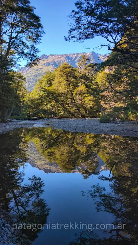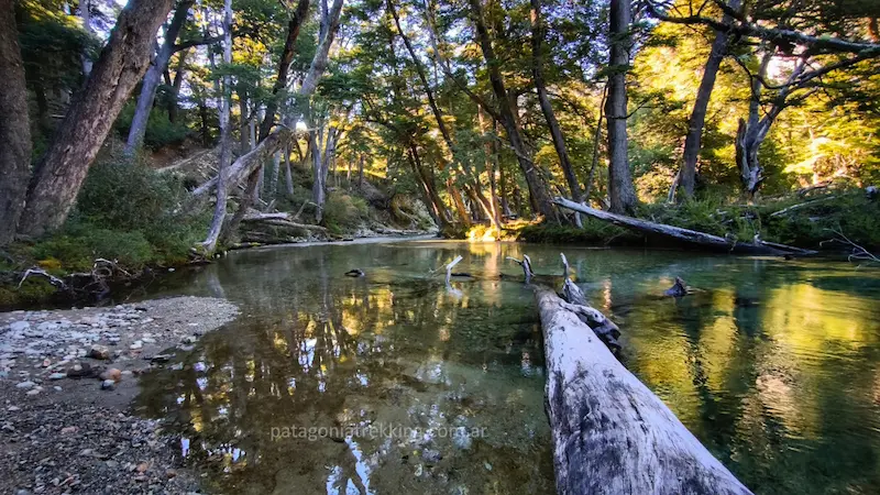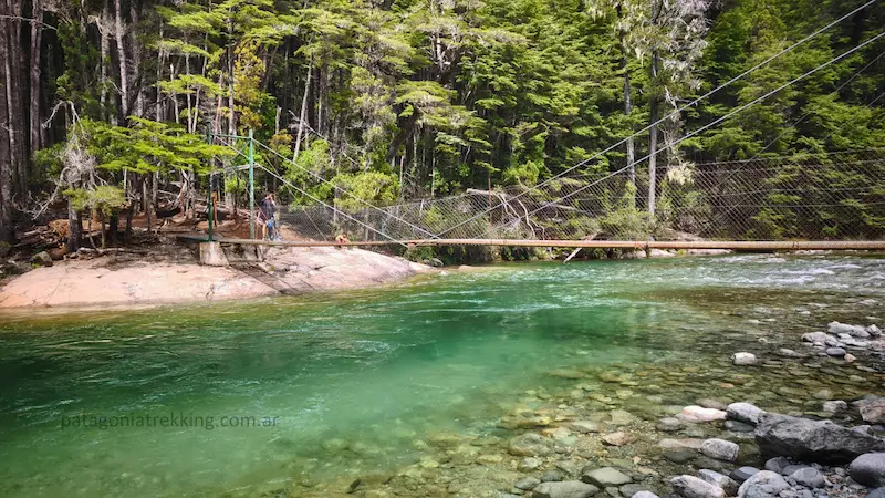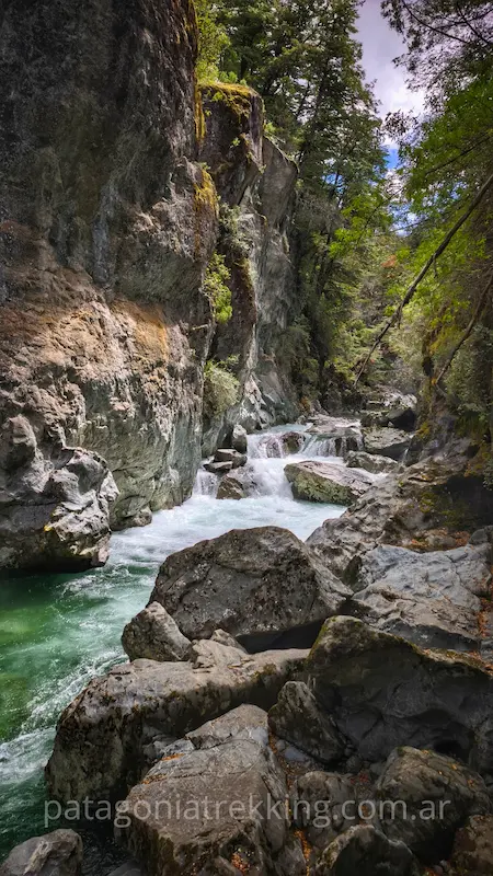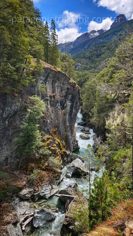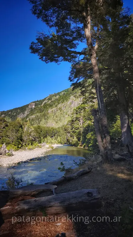 Dejando La Horqueta, hay un recodo del Azul muy fotogénico antes de entrar al bosque. El camino sube y se mete de nuevo en la espesura. Empieza el tramo hasta el Mallín de los Chanchos, con el desvío a Encanto Blanco (que queda en otro valle) y la llegada a Los Mañíos.