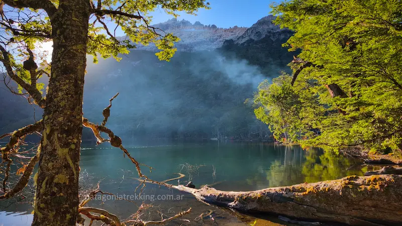 Esta subida tiene un par de pendientes realmente intensas que me obligaron a encararlas en cuotas. Por momentos, me encontraba apoyando las manos en las rodillas y con la mirada en el suelo, mientras las gotas de transpiración golpeaban la tierra. Cuando finalmente la subida afloja, en poco tiempo aparece el Lago Lahuán y el camino lo rodea hasta llegar al refugio.