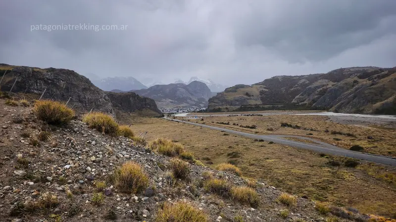 Empecé a caminar un miércoles antes del mediodía, dejando atrás El Chaltén bajo una llovizna leve. Después de pasar la oficina de informes del PN Los Glaciares, el sendero sube gradualmente por la falda de Loma del Pliegue Tumbado, atravesando un ambiente de estepa.