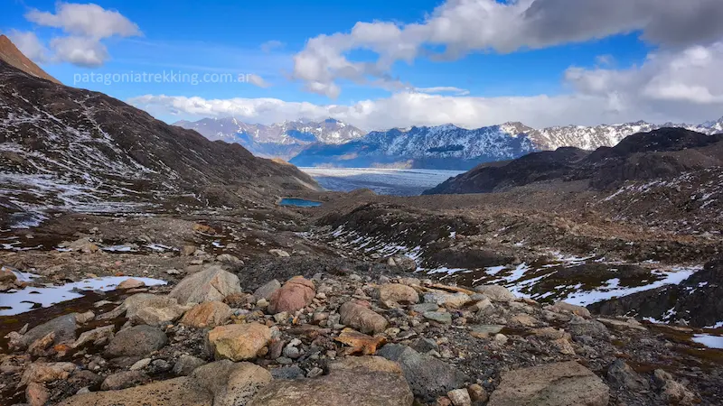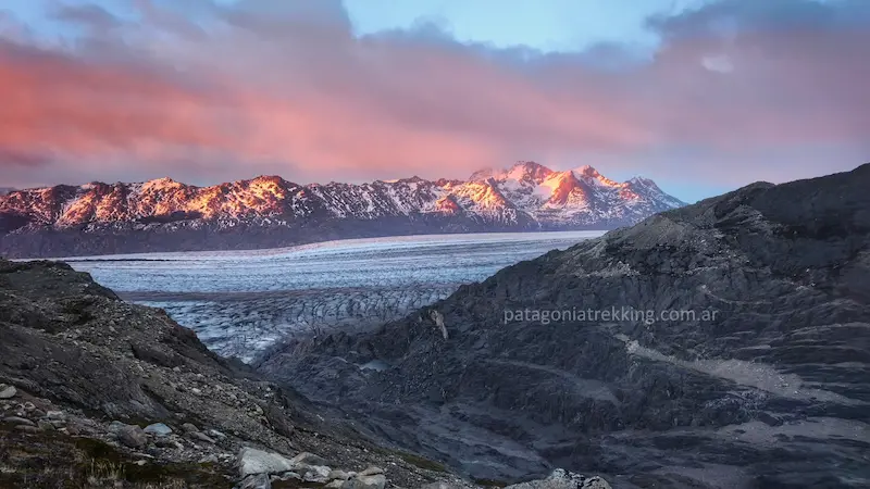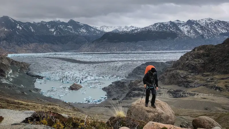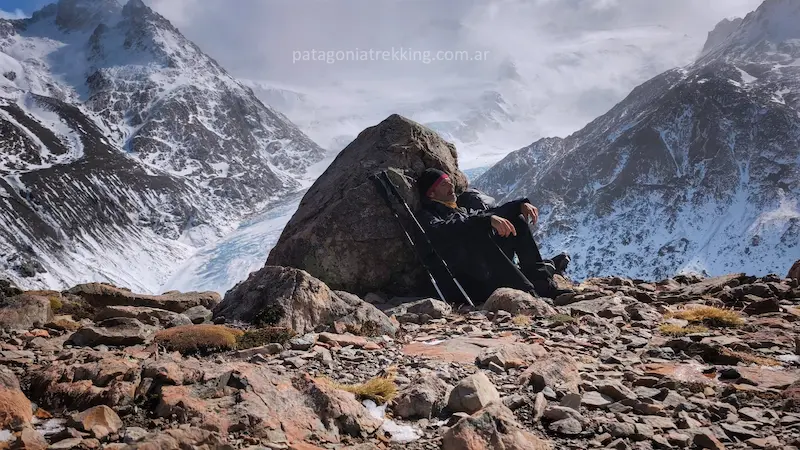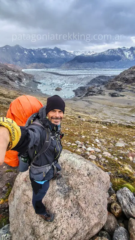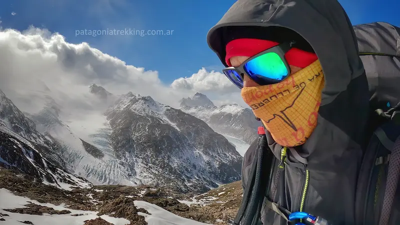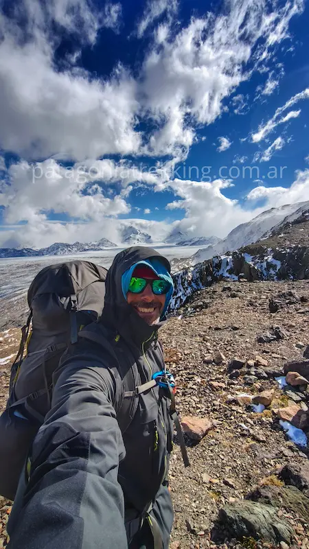 El recorrido: Es el día más técnico y visualmente impactante. Incluye el primer cruce de tirolesa (o vadeo) sobre el río Túnel y el tránsito sobre el Glaciar Túnel Inferior, donde se camina sobre una mezcla de hielo y piedra suelta. Saliendo del glaciar el punto crítico es el ascenso final de 3 kilómetros con 600 metros de desnivel por un acarreo a veces inestable hasta el Paso del Viento (1400 msnm). Es la jornada donde se gana el acceso a los Hielos Continentales y se requiere mayor atención a la navegación sobre el hielo.