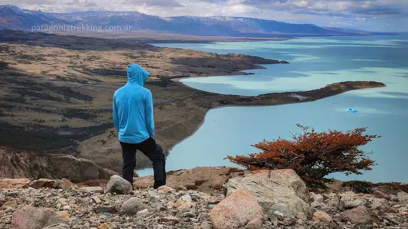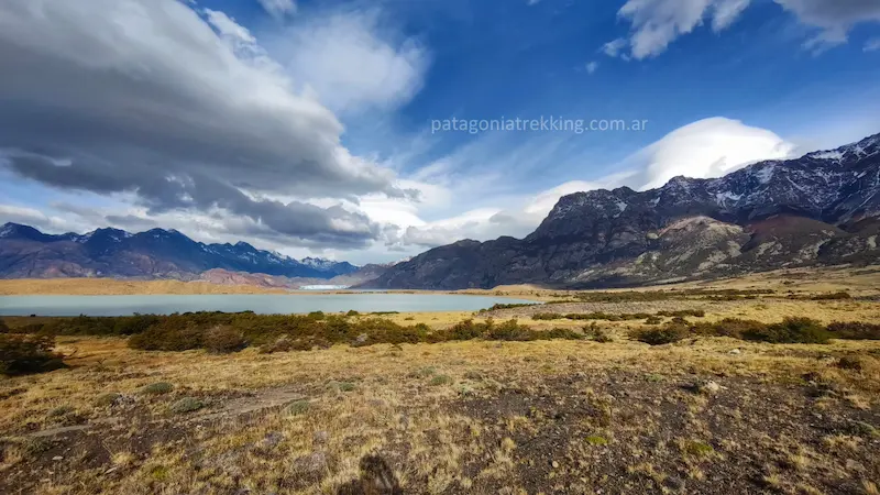Seguí bordeando el lago hasta cruzar un arroyo. Poco después, el sendero se separa de la costa y empieza una subida lenta por la estepa. Es un paisaje enorme de pastizales con restos de árboles de algún viejo incendio. Me iba despidiendo del lago y de la pared del Glaciar Viedma.