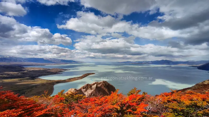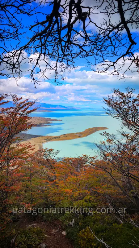 A pocos metros del paso, bajando hacia el este, el viento dejó de alcanzarme. El silencio me rodeó de golpe. Aparecieron las primeras lengas rojas contrastando con el celeste del cielo y ese color irreal del lago. Escuché mis pasos sobre el pasto del mallín y el vuelo de unos pájaros.