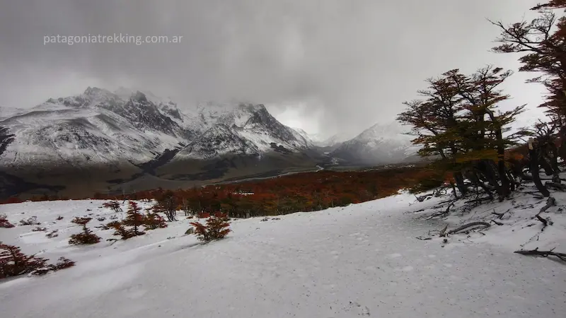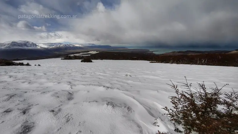 Al salir del bosque, el paisaje se abrió hacia el sur. Aparecieron algunas estacas y el rumbo se hizo claro. Caminaba en subida sobre un manto blanco, donde los pasos se hundían hasta el tobillo. Debajo de nubes espesas apareció el Lago Viedma y, más al este, la estepa que antecede al pueblo de El Chaltén.