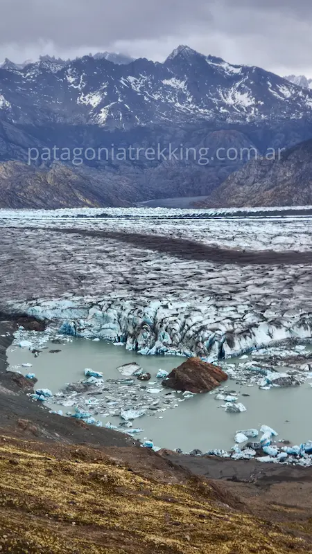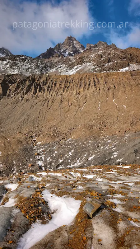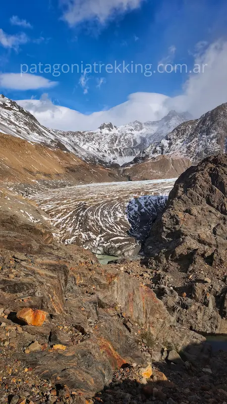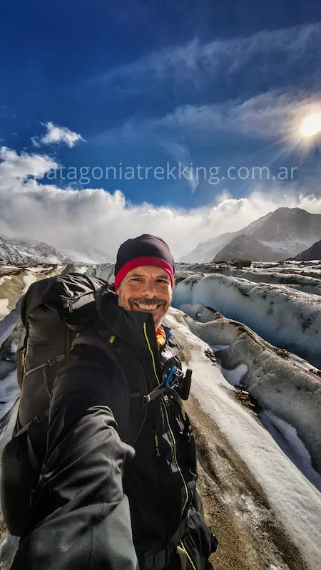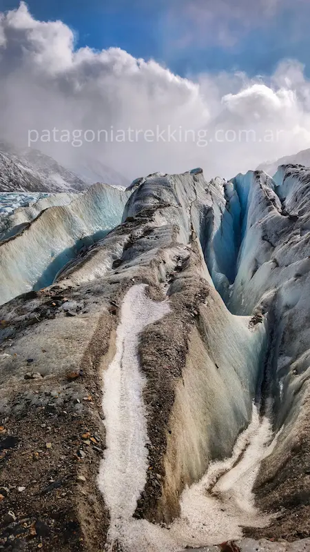 Vas a caminar sobre el Glaciar Túnel Inferior. Aunque es “hielo sucio” y no requiere crampones si elegís bien la ruta, el terreno es inestable. Hay grietas y, sobre todo, una capa de hielo negro muy resbaladiza bajo las piedras de la morena.