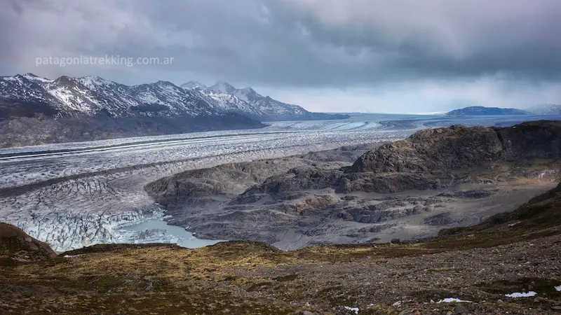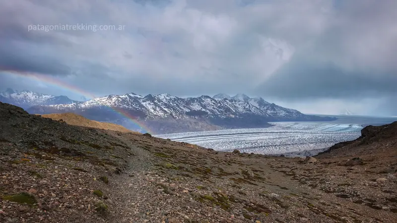 Seguí camino, vadeé un arroyo sin complicaciones y encaré el tránsito hacia el Paso Huemul. Antes de llegar al mirador del Glaciar Viedma, el sendero empieza una subida lenta y constante por la ladera. Eran los últimos metros con vista al Campo de Hielo.